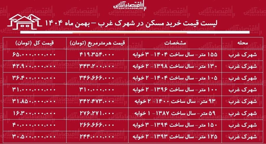 لیست قیمت خرید مسکن در شهرک غرب + جدول
